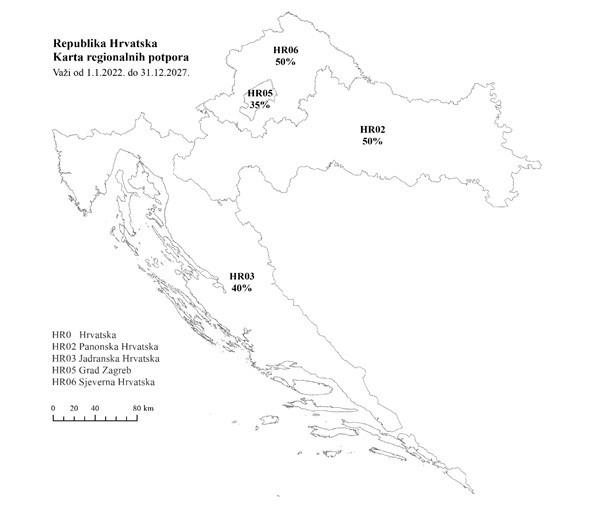 Na regionalnoj karti Hrvatske definirane su hrvatske regije koje imaju pravo na regionalnu investicijsku potporu te je za svaku od njih utvrđen maksimalni intenzitet potpore. Intenzitet potpore maksimalni je iznos državne potpore koji se može dodijeliti po korisniku, izražen kao postotak prihvatljivih troškova ulaganja.
